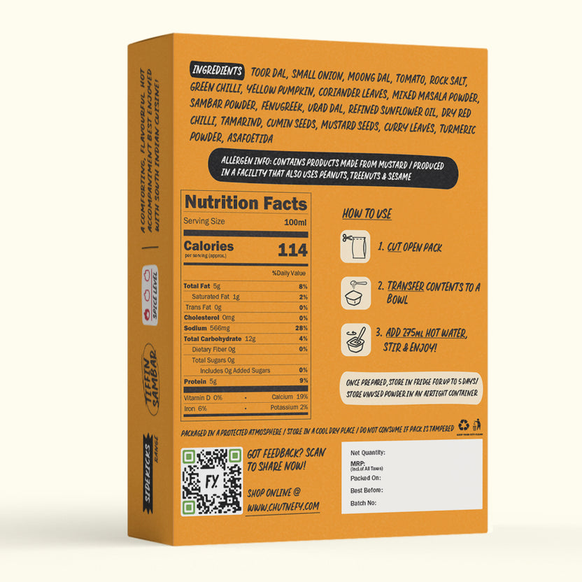 Each Chutnefy Sambar comes in an easy, convenient single-use pack to give you the flavour punch that'll hit the spot every single time, and gives you ~125ml of Sambar once mixed - easily enjoyed by 2!