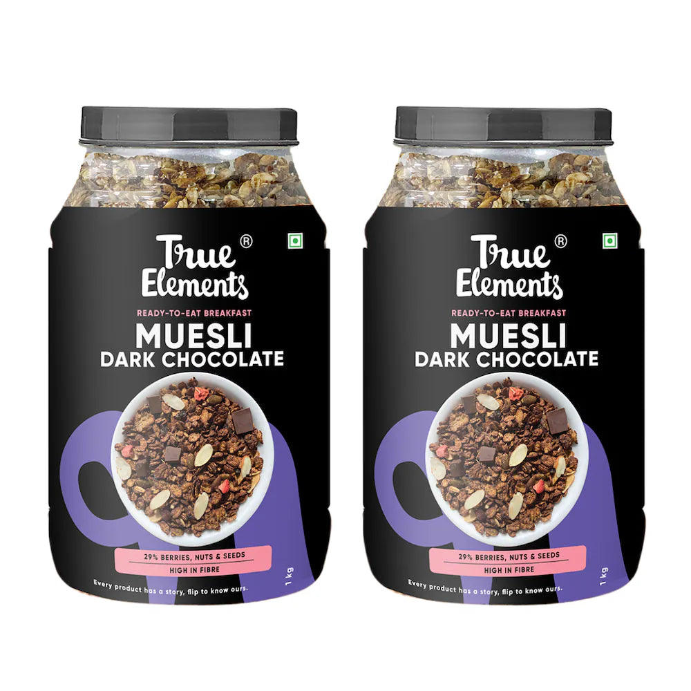 True Elements Dark Chocolate Muesli is a perfect blend of wholesome ingredients like 100% whole grains like Rolled Oats, Wheat flakes & Jowars flakes, crunchy seeds & nuts and sweetened with jaggery and Raw honey.Your dull breakfast days are over! Start your day with a delectable, guilt-free delight with True Elements Dark Chocolate Muesli. Wheat flakes & rolled oats are coated with Alkalised Cocoa Powder to reduce the side effects of cocoa powder like bloating, constipation etc. This antioxidant-rich muesli is sweetened with Jaggery and Raw Honey to avoid the consumption of empty calories through refined sugar. This guilt-free muesli can give an energizing start to your day when consumed along with milk. The wholesome ingredients can keep your sudden hunger pangs at bay. True Elements has always stayed true to those who love enjoying the food in its very own natural form made out of natural ingredients. No Fillers, no preservatives, nothing artificial. Add your favourite toppings to it, to enjoy your most important meal of the day. Include this in your diet for a healthy lifestyle. Helps in weight management.