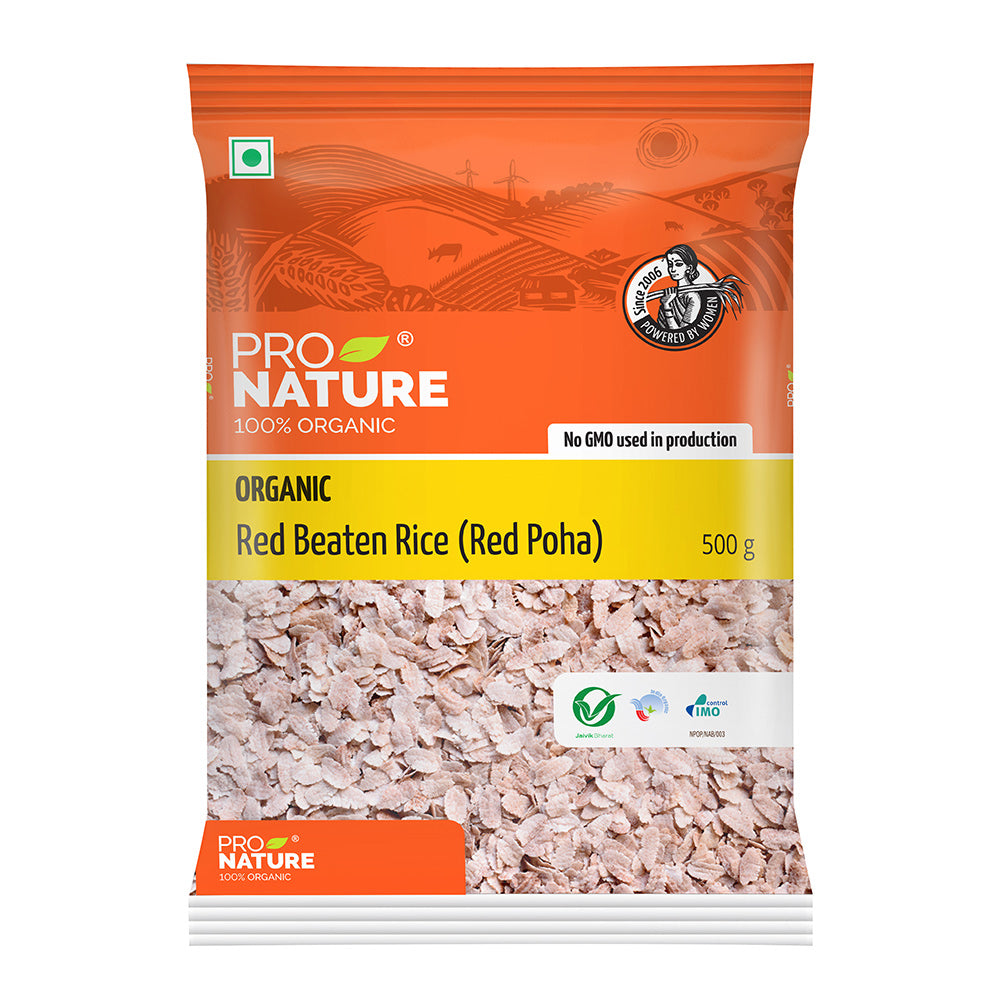 Pro Nature 100 percent Certified Organic Beaten rice (poha) made from the finest quality red rice sourced from certified organic farms, grown without the use of any chemicals, pesticides, or insecticides. It is naturally gluten-free and makes a healthy, light & tasty breakfast snack. It does not have cholesterol and trans fat. Red Poha can be mixed with vegetables to make it rich in vitamins, minerals, and fiber.